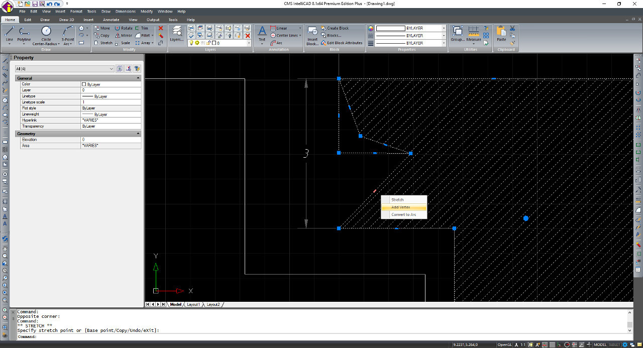 Starting from CMS IntelliCAD 8.1 is also able to modify polylines entities by stretching grip points, adding or removing vertices, converting a line segment to an arc segment and , reversely, converting an arc segment to a line.